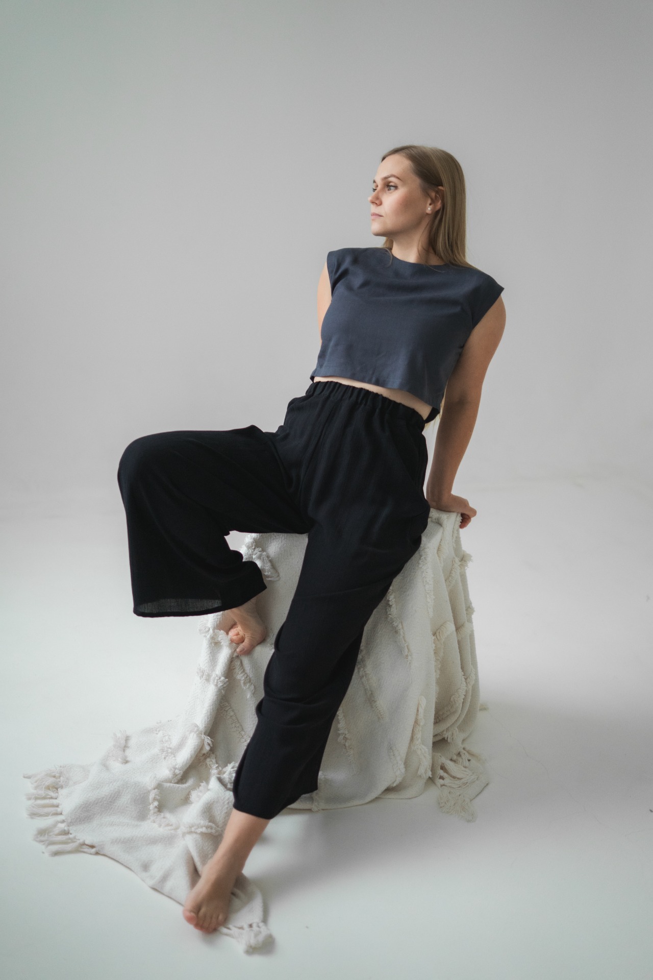 Kalhoty Asteria jsou ušité z lehké směsi viskózy a lnu. Pyšní se volným vzdušným střihem a vysokým pasem na gumu, který se nejen přizpůsobí postavě, ale krásně zvýrazní pas a podtrhne ženské křivky.