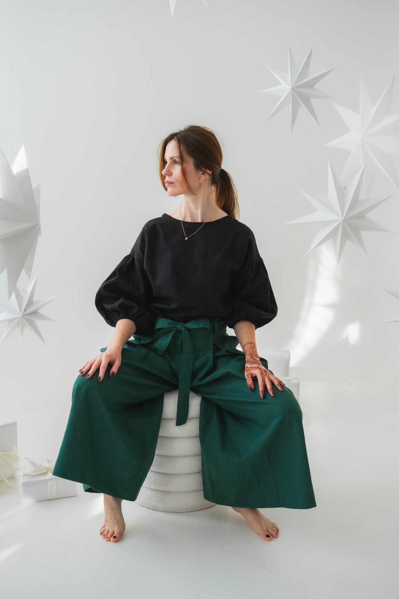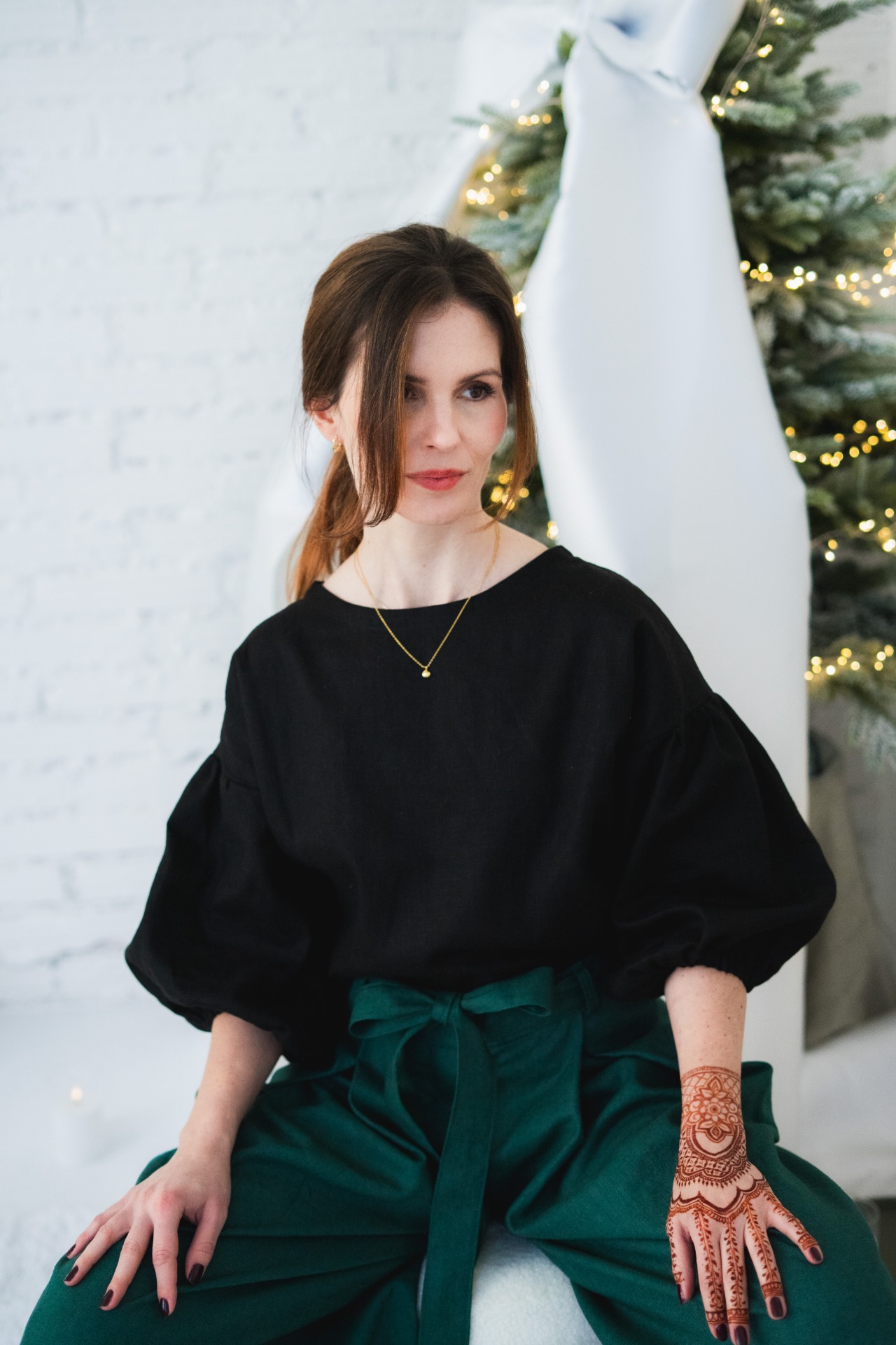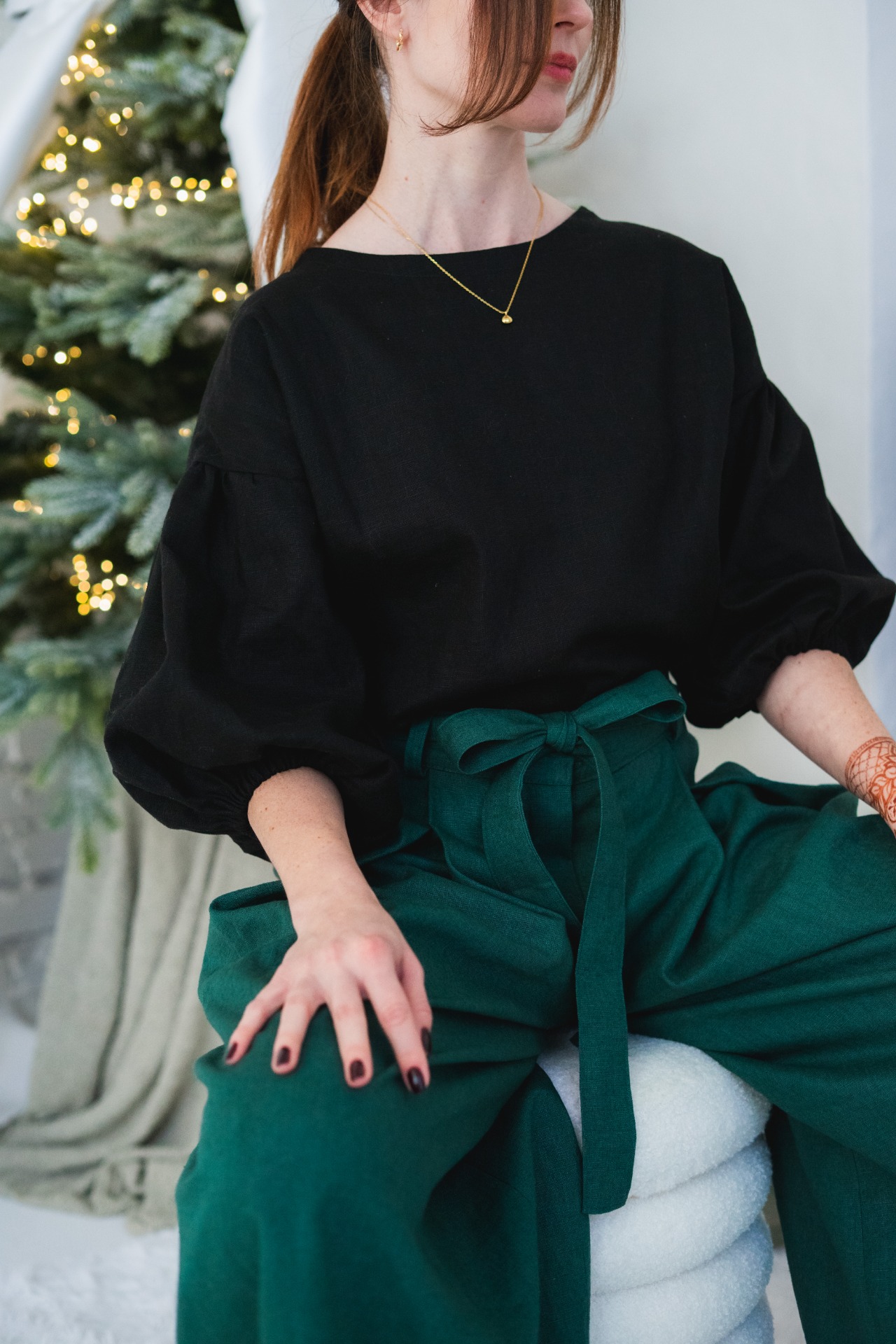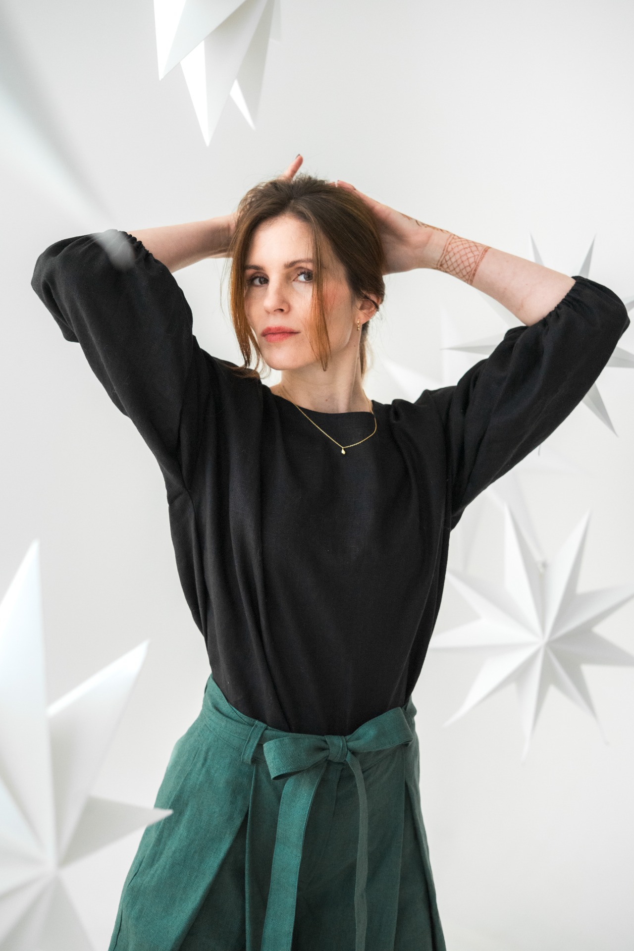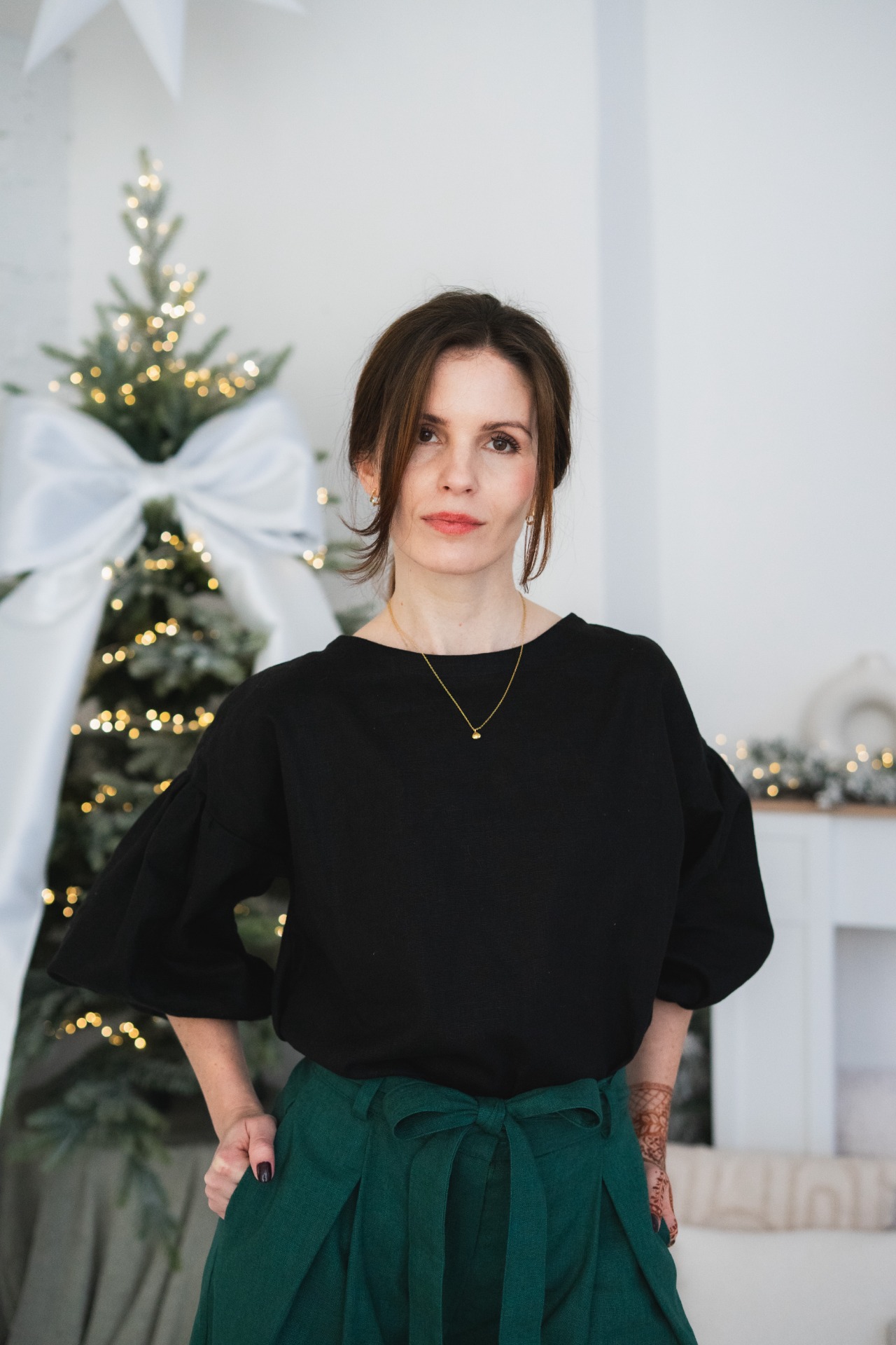 Halenka Meda je ušitá z kvalitní směsi lnu a bavlny, má volnější střih, balonové rukávy a krásný jemný proužkovaný vzor. Díky gumičkám na rukávech a pohodlnému střihu se hodí na každodenní nošení i svátečnější chvíle.