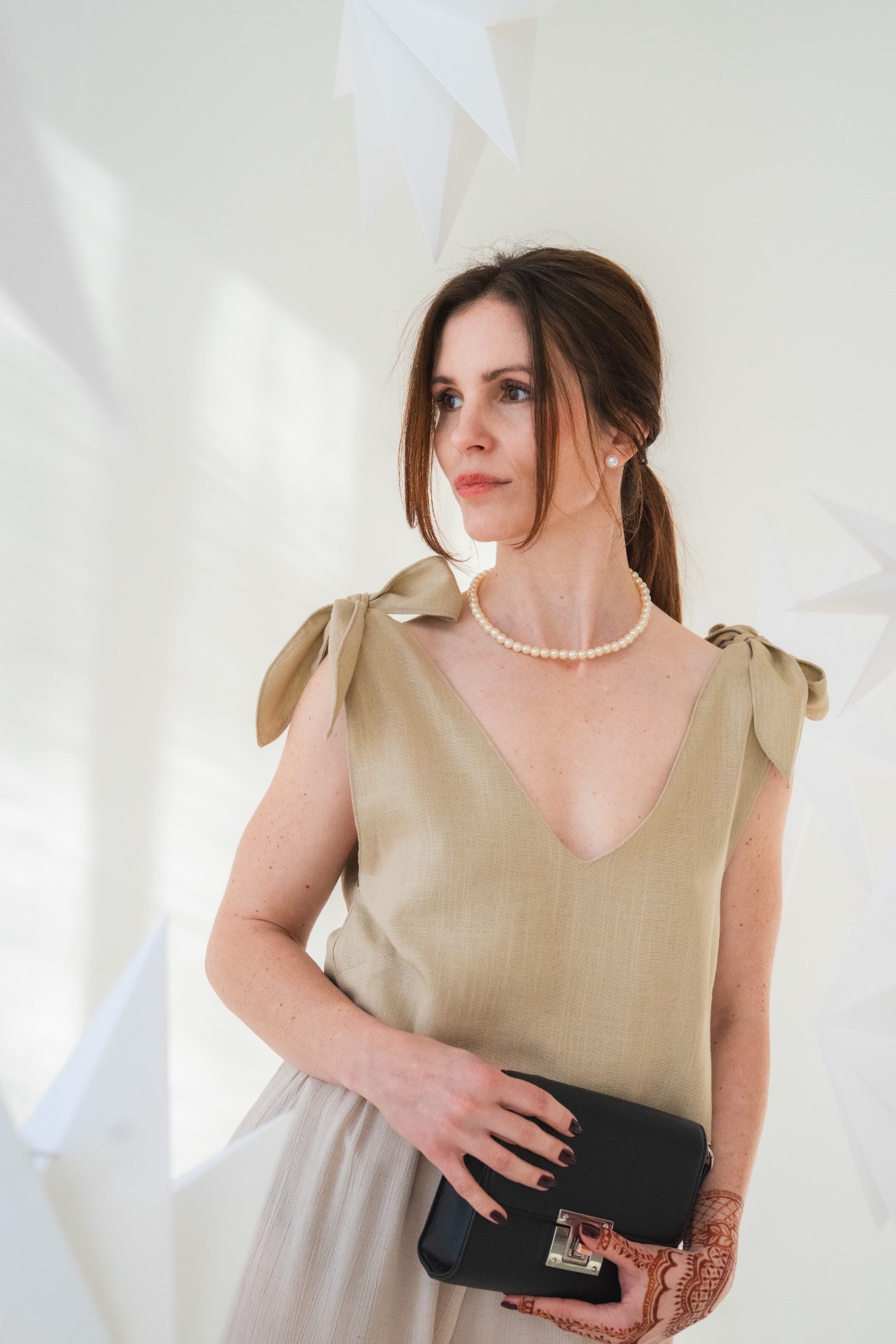 Vzdušnej top z lnu, co se váže na ramenou – jen tak, mašlí. Žádná velká věda, ale má v sobě něco, co tě zpomalí. Možná je to ten střih, možná ten moment.