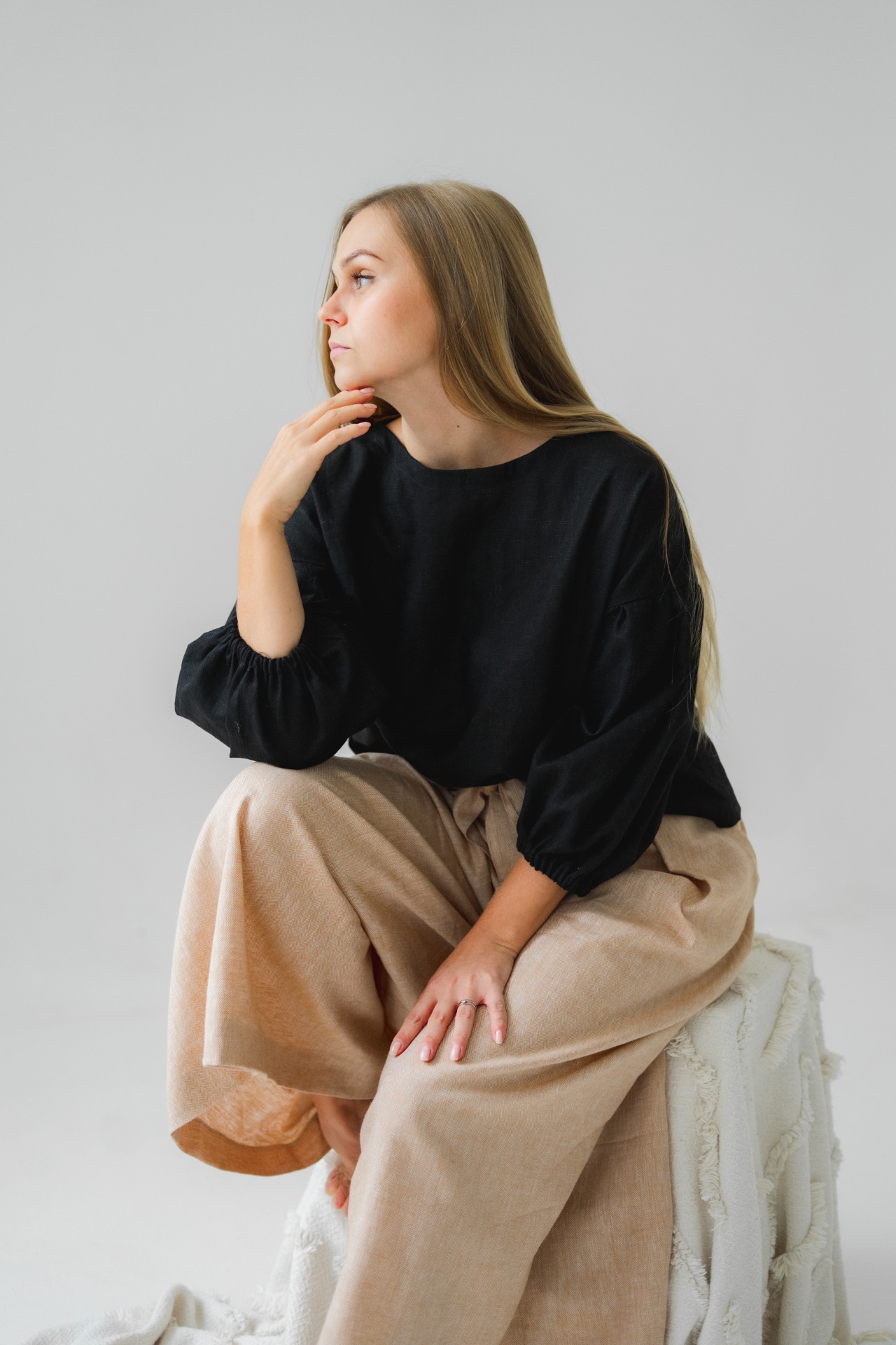 Halenka Meda je ušitá z kvalitní směsi lnu a bavlny, má volnější střih, balonové rukávy a krásný jemný proužkovaný vzor. Díky gumičkám na rukávech a pohodlnému střihu se hodí na každodenní nošení i svátečnější chvíle.
