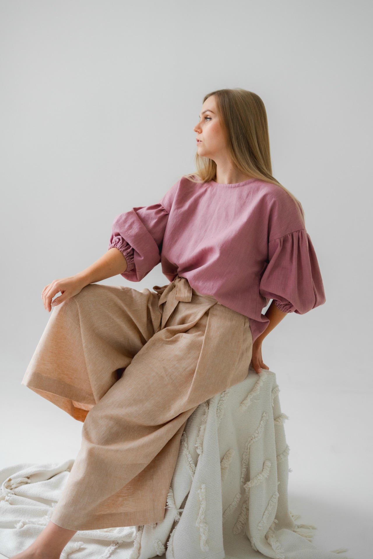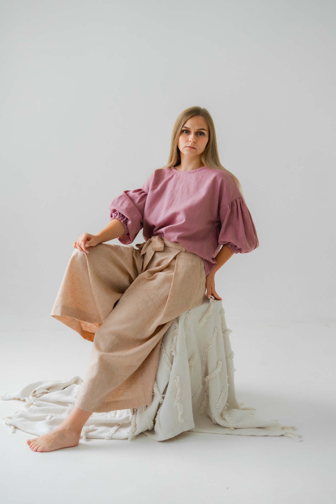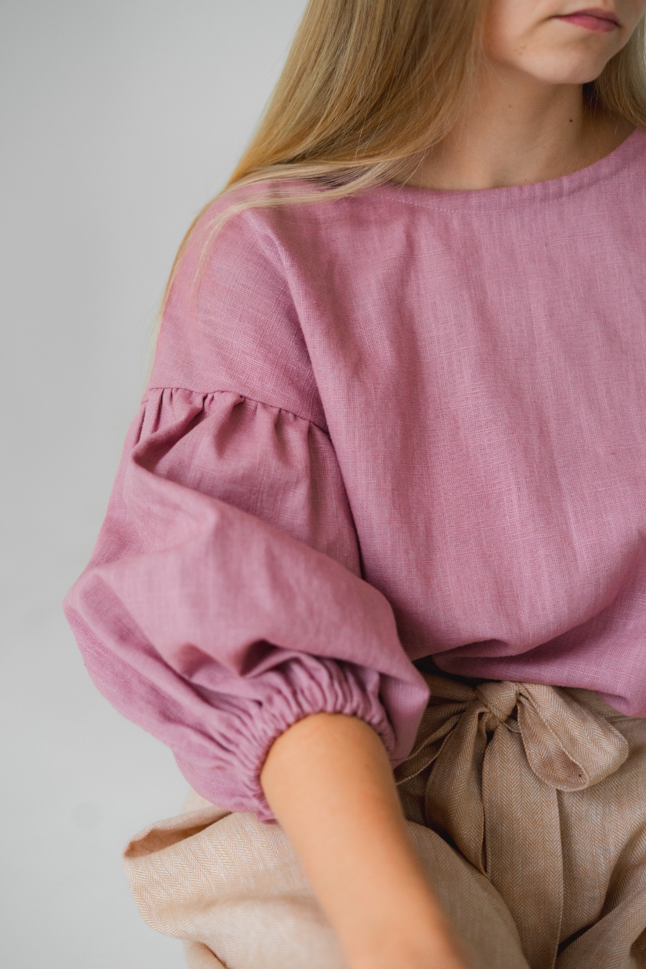 Halenka Meda je ušitá z kvalitní směsi lnu a bavlny, má volnější střih, balonové rukávy a krásný jemný proužkovaný vzor. Díky gumičkám na rukávech a pohodlnému střihu se hodí na každodenní nošení i svátečnější chvíle.