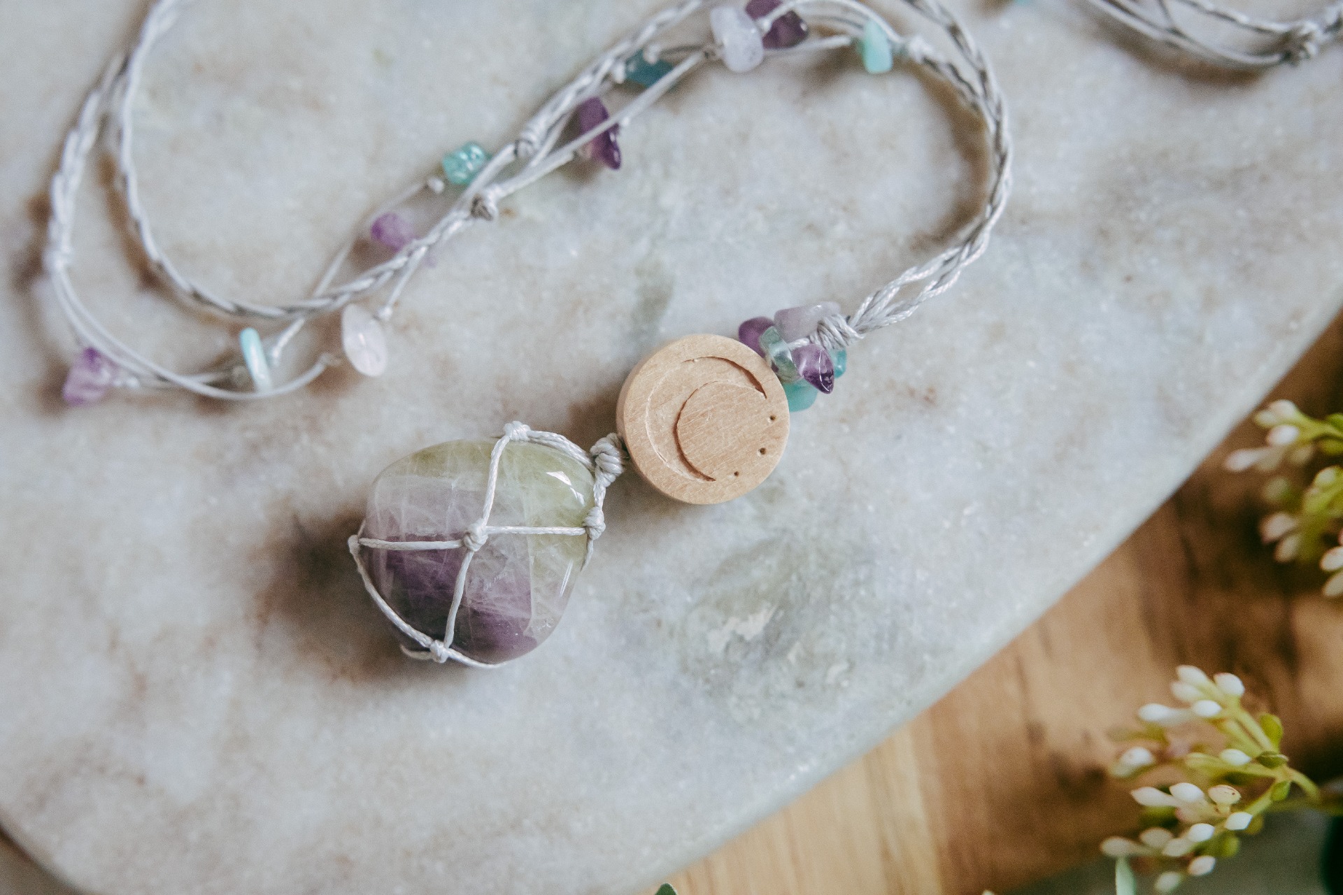 Náhrdelník je ručně pleteným originálem, který dále zdobí zlomky ametystu, akvamarínu, krystalu a chalcedonu