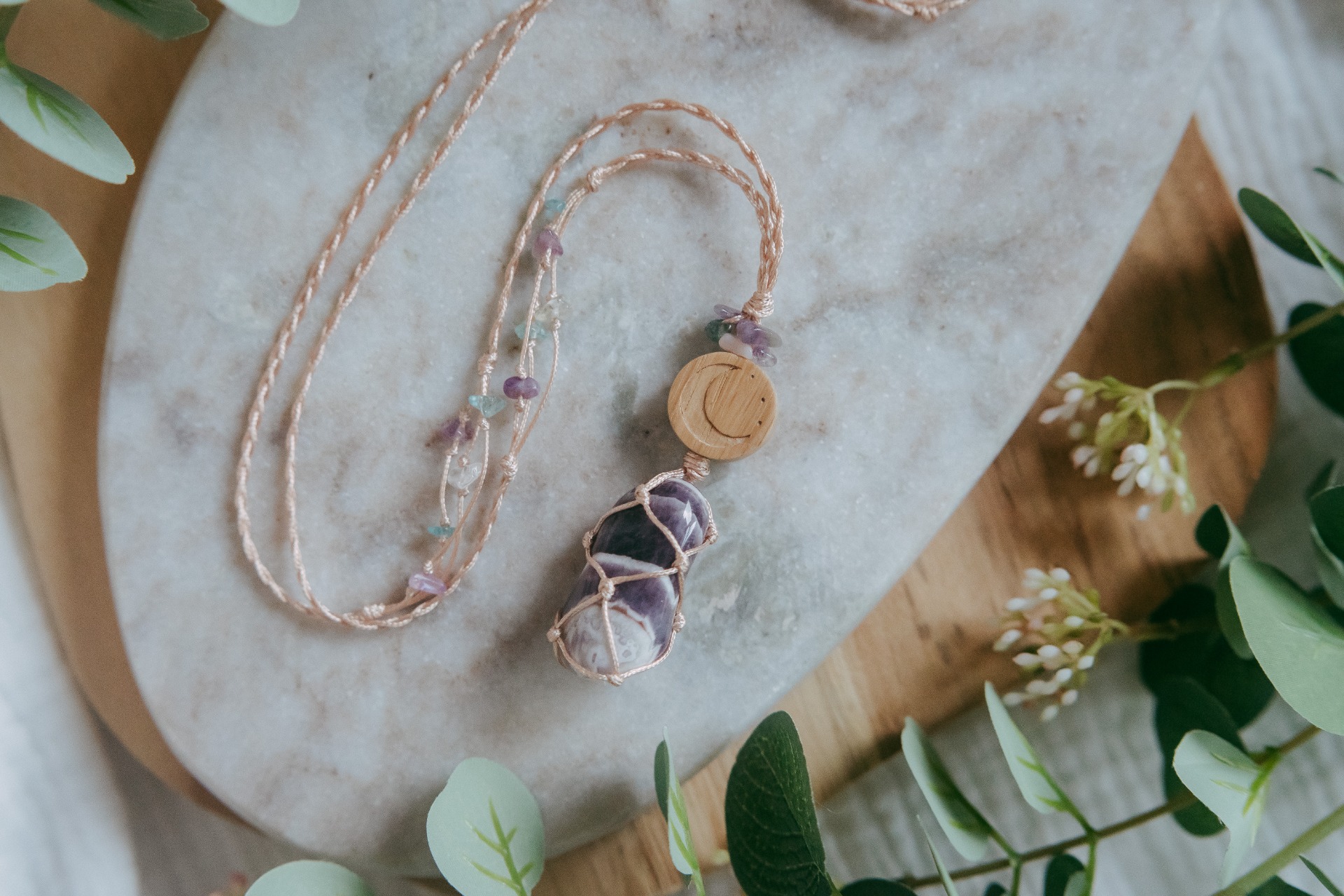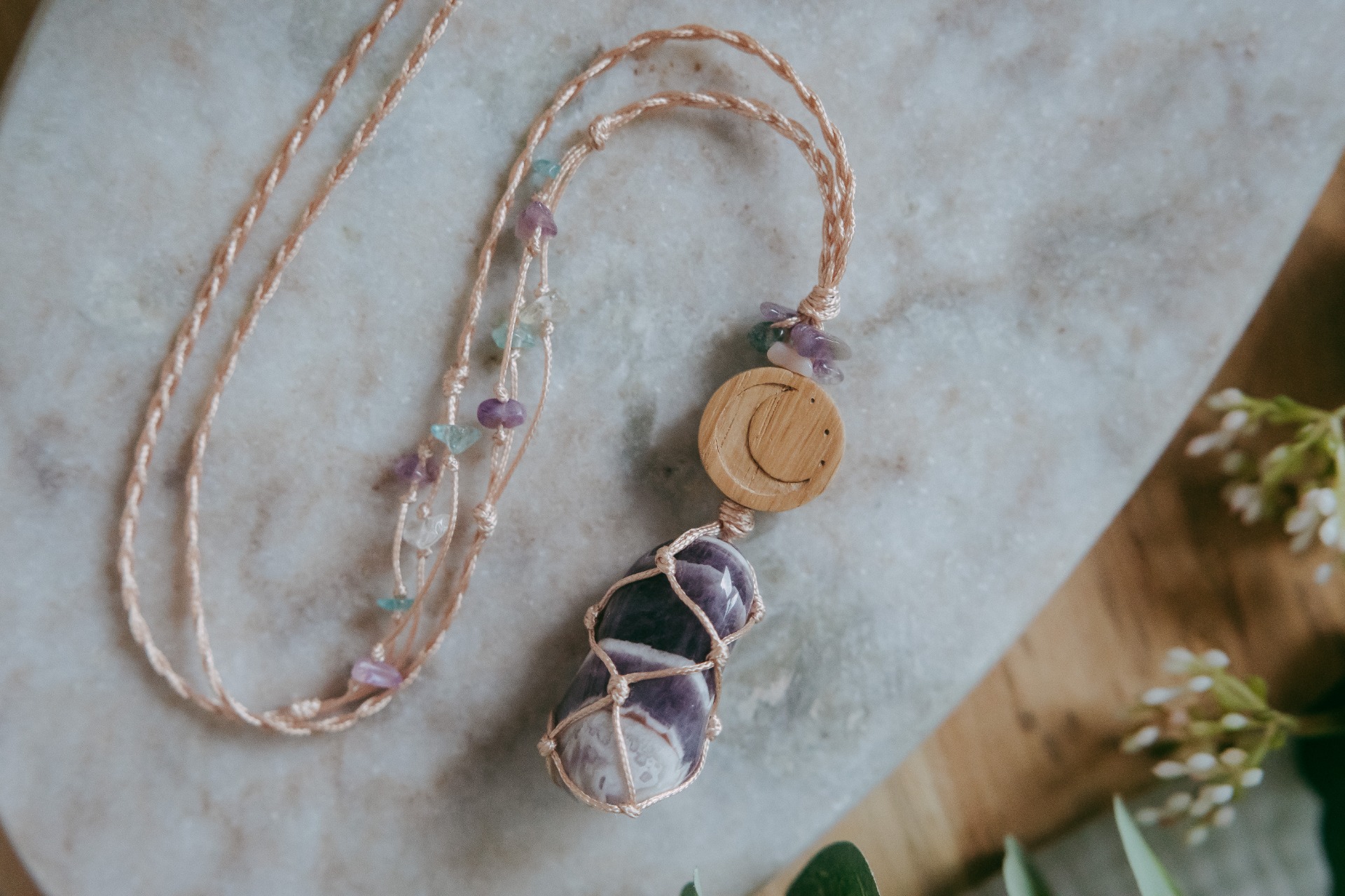 Náhrdelník je ručně pleteným originálem, který dále zdobí zlomky ametystu, akvamarínu, čaroitu a krystalu