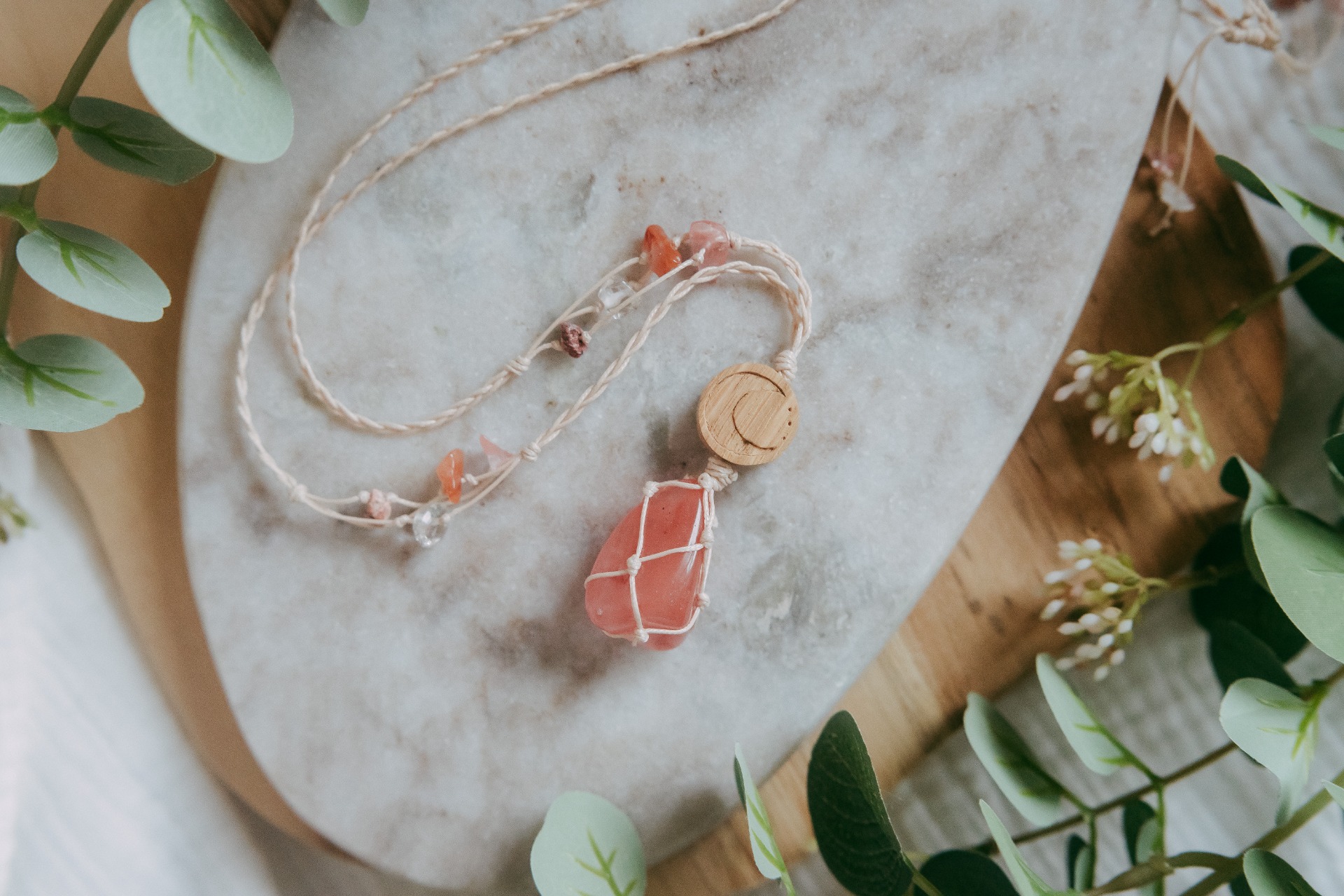 Náhrdelník je ručně pleteným originálem, který dále zdobí zlomky jahodového křemene, karneolu, krystalu a leopardího jaspisu