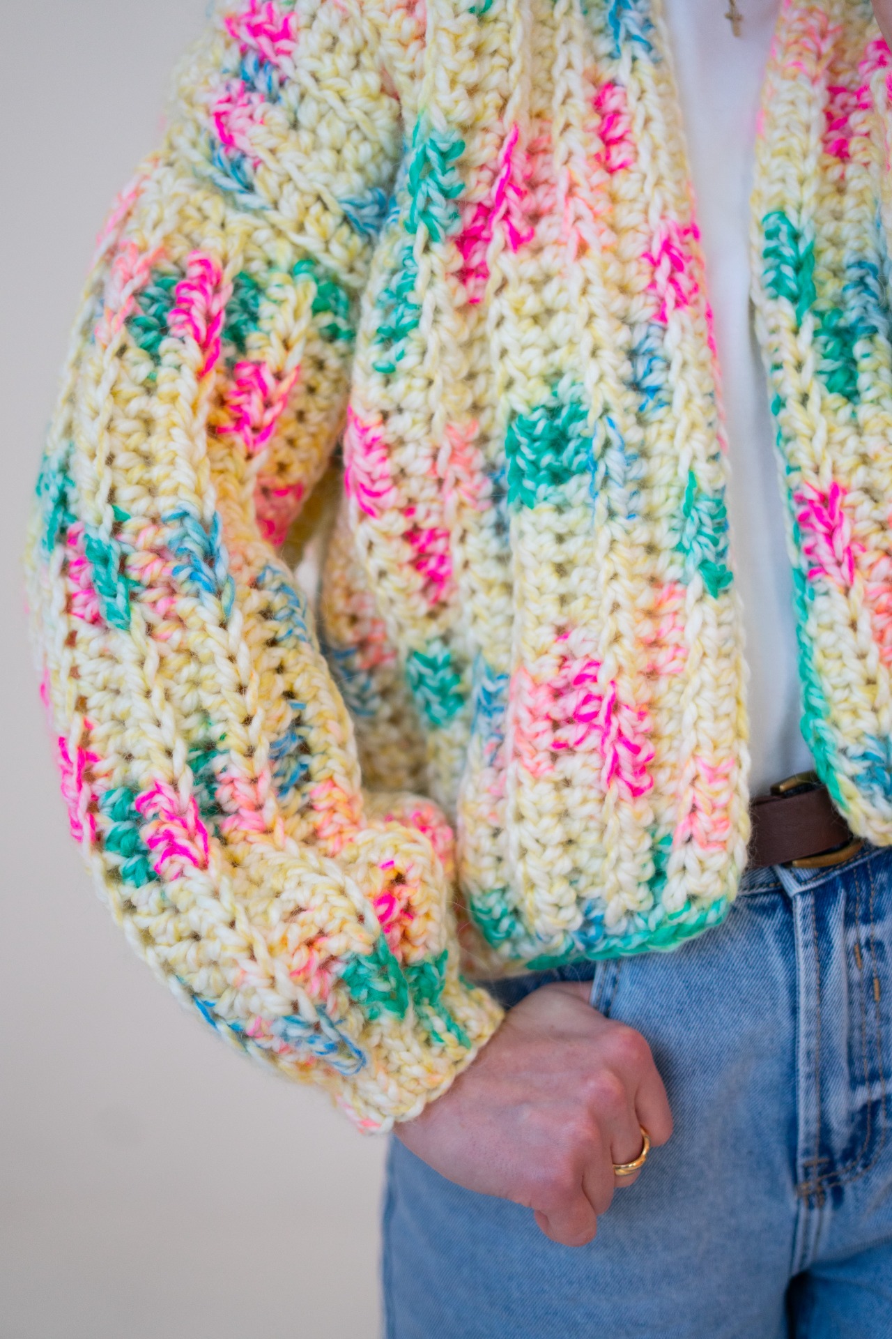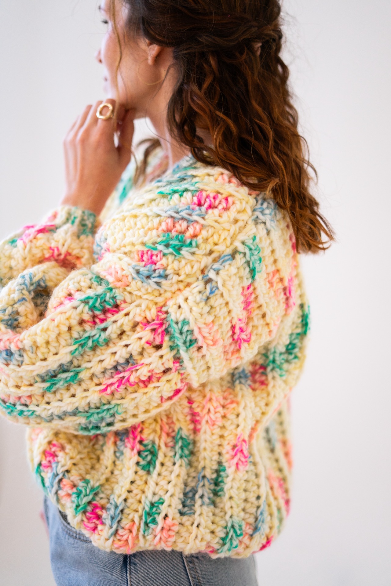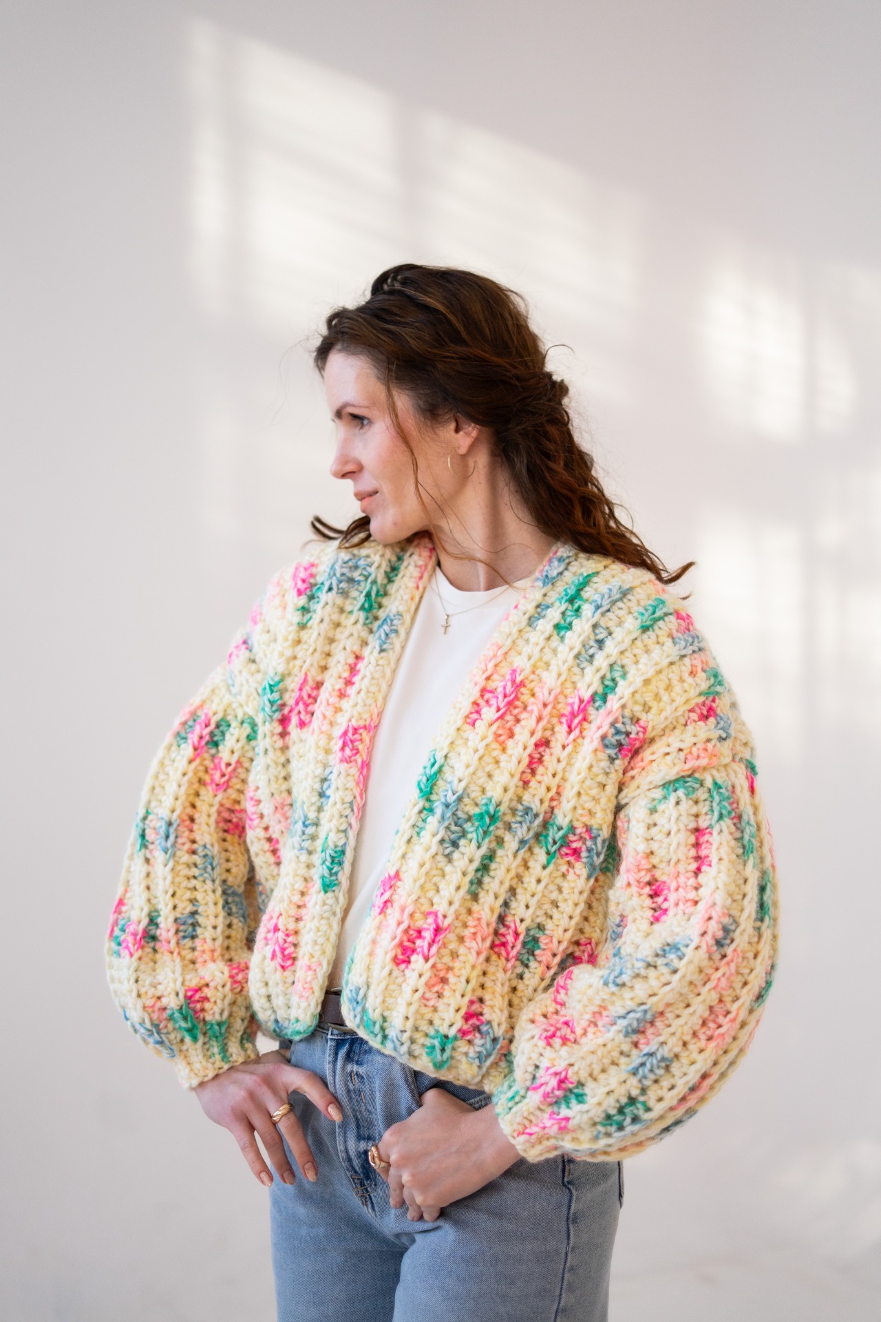Ručně háčkovaný vlněný svetr je malý zázrak. Barevný, hravý, měkký...připomíná dětství, kdy bylo všechno možné. Balonové rukávy mu dávají ženskost, objem, zatímco barvy ti dodají odvahu zazářit i v obyčejný den.