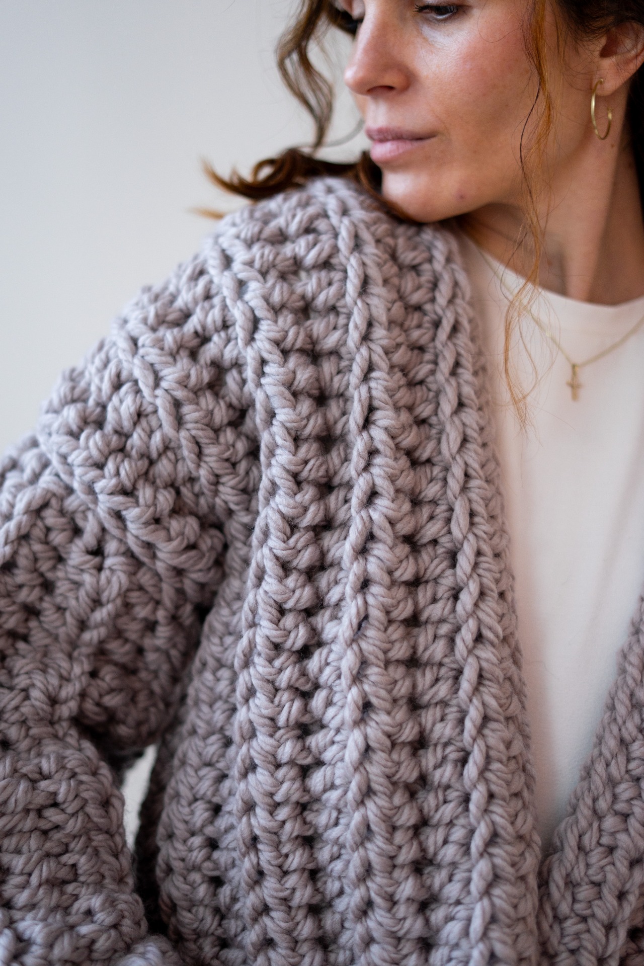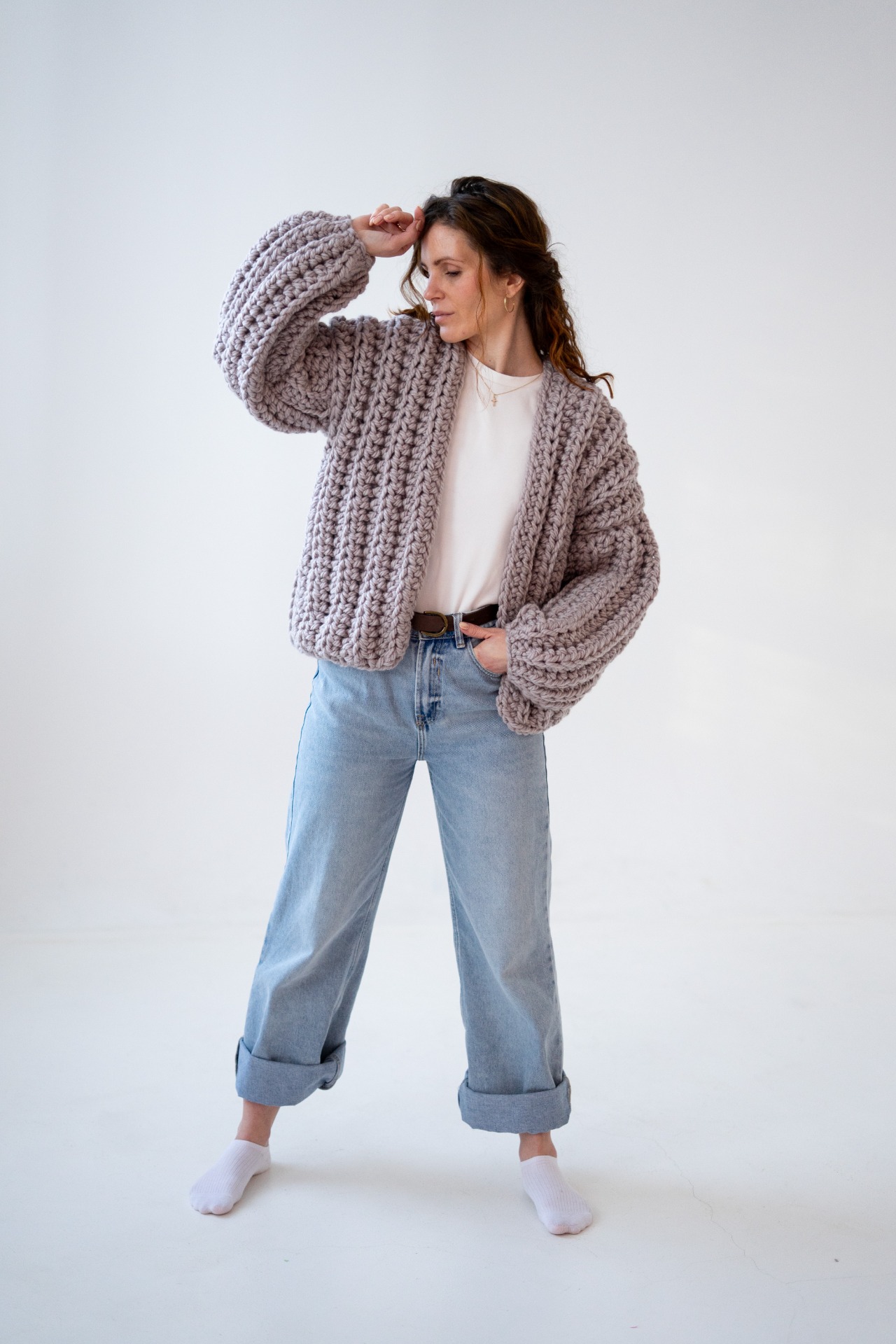 Ručně háčkovaný vlněný svetr v šedobéžovém odstínu je malý zázrak, který působí jako tiché útočiště. Uháčkovaný ze silnější příze, která v sobě nese stopu rukou, času a pomalosti. Balonové rukávy mu dodávají lehkost, ženskost a objem.