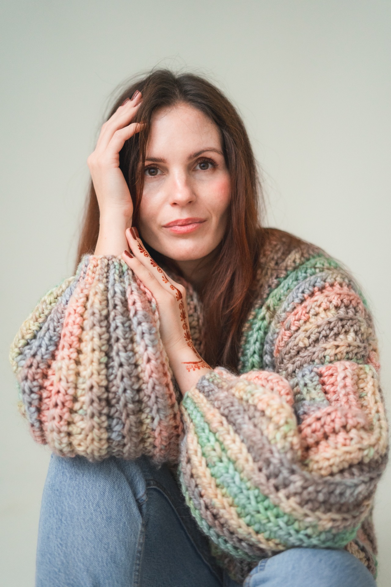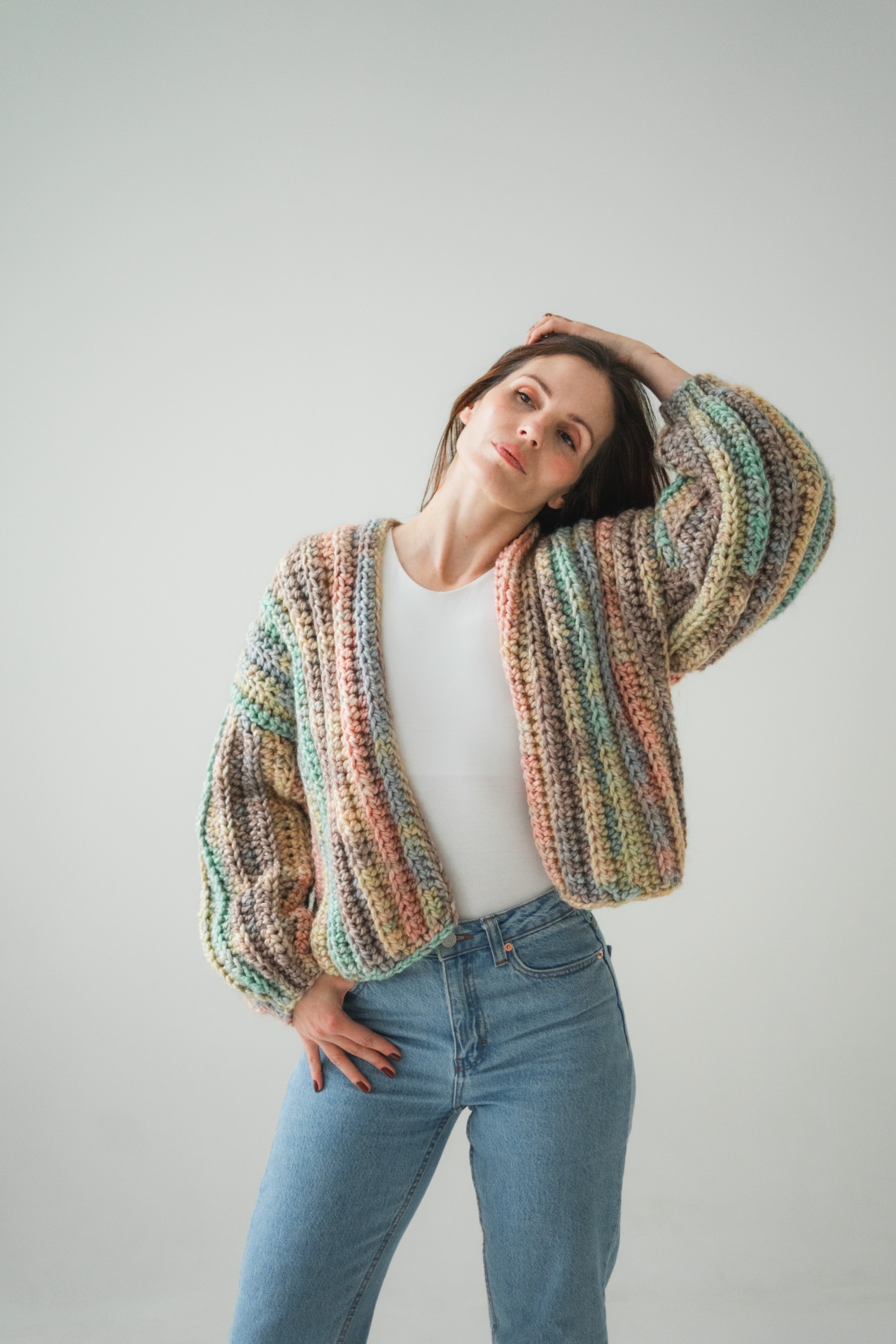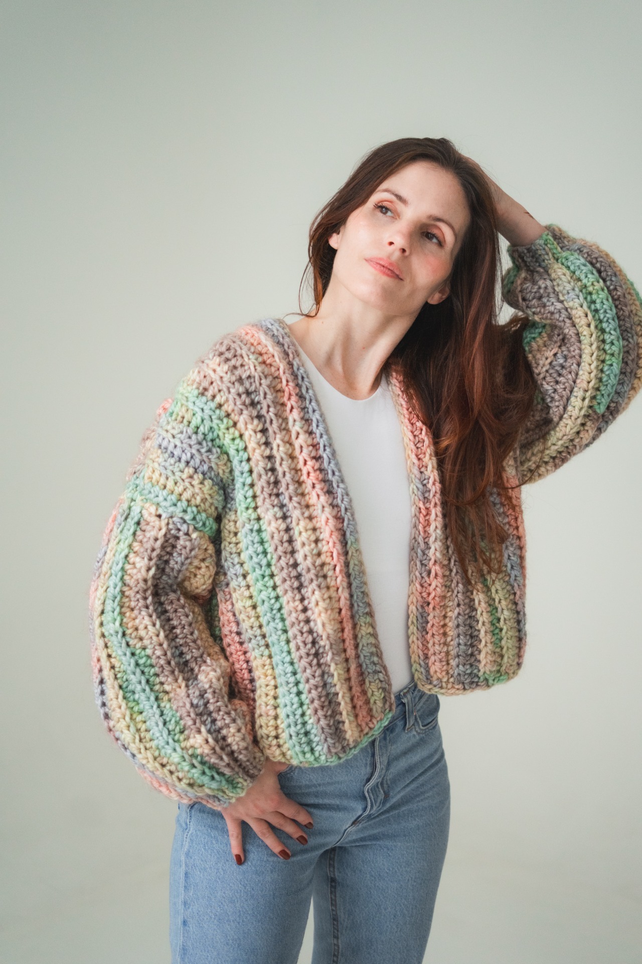 Ručně háčkovaný svetr s balonovými rukávy a hravým barevným vzorem. Měkký, stylový a příjemný. Ideální pro chladné dny, kdy chceš dodat outfitu barvu, osobitost a ještě zůstat v teple. Pro citlivější pokožku může být vlna na holou kůži trochu kousavá, což ale triko s dlouhým rukávem hravě vyřeší.