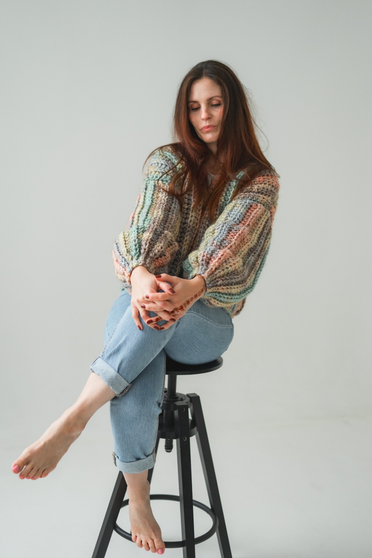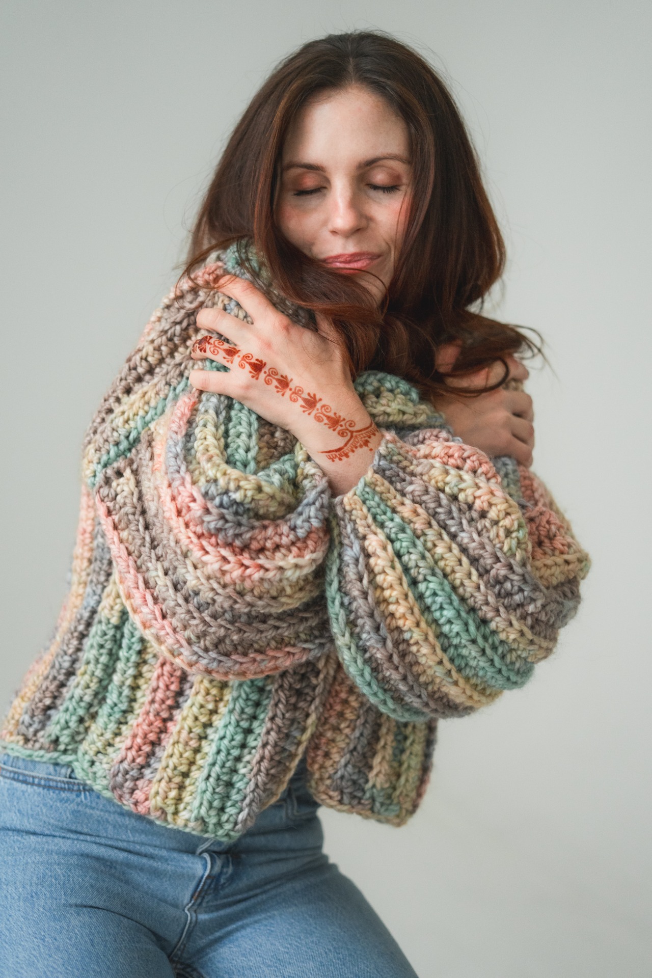 Ručně háčkovaný vlněný svetr je malý zázrak. Barevný, hravý, měkký...připomíná dětství, kdy bylo všechno možné. Balonové rukávy mu dávají ženskost, objem, zatímco barvy ti dodají odvahu zazářit i v obyčejný den.