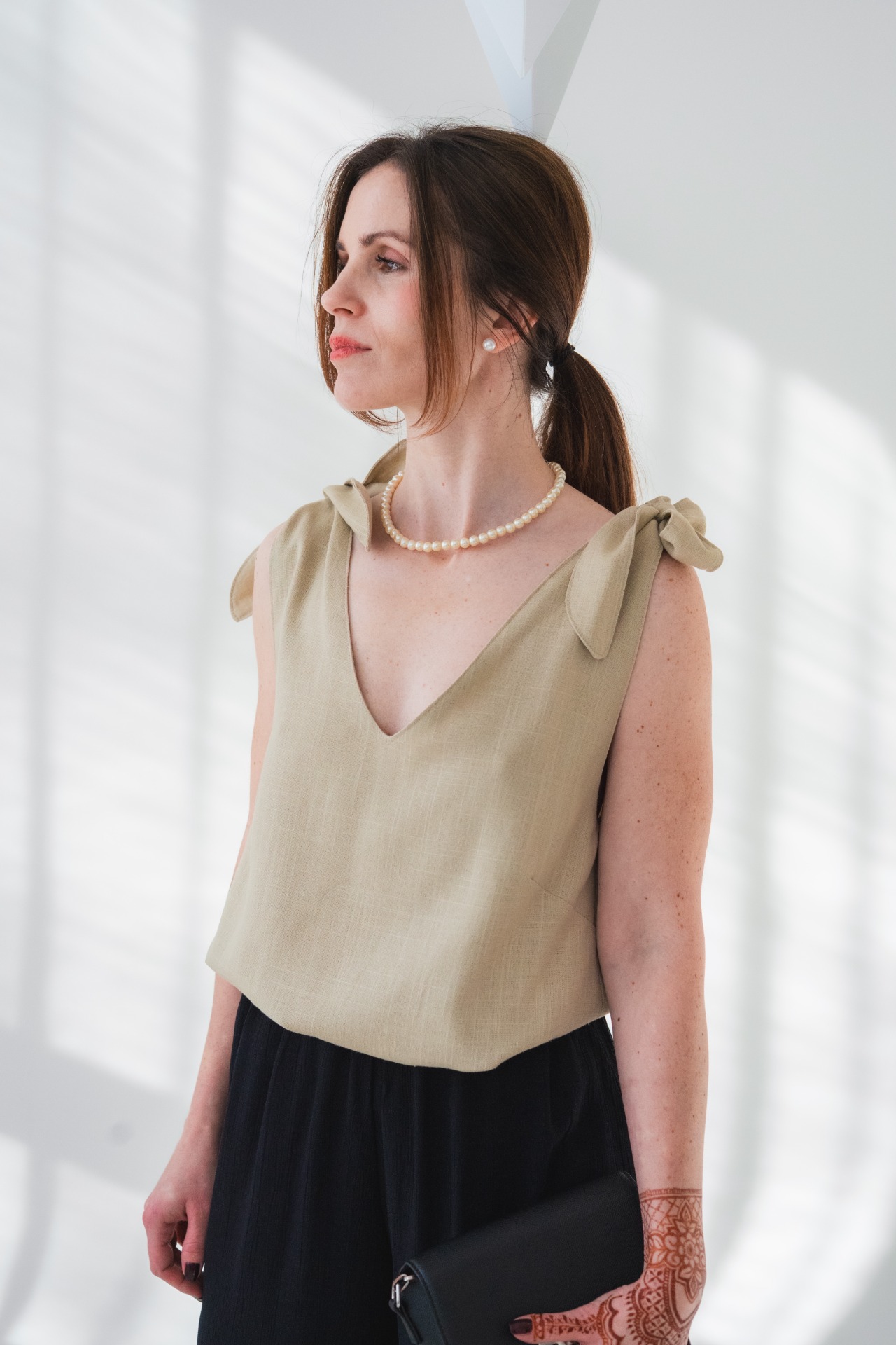 LEAH - lněný top s mašlí - sandy beige